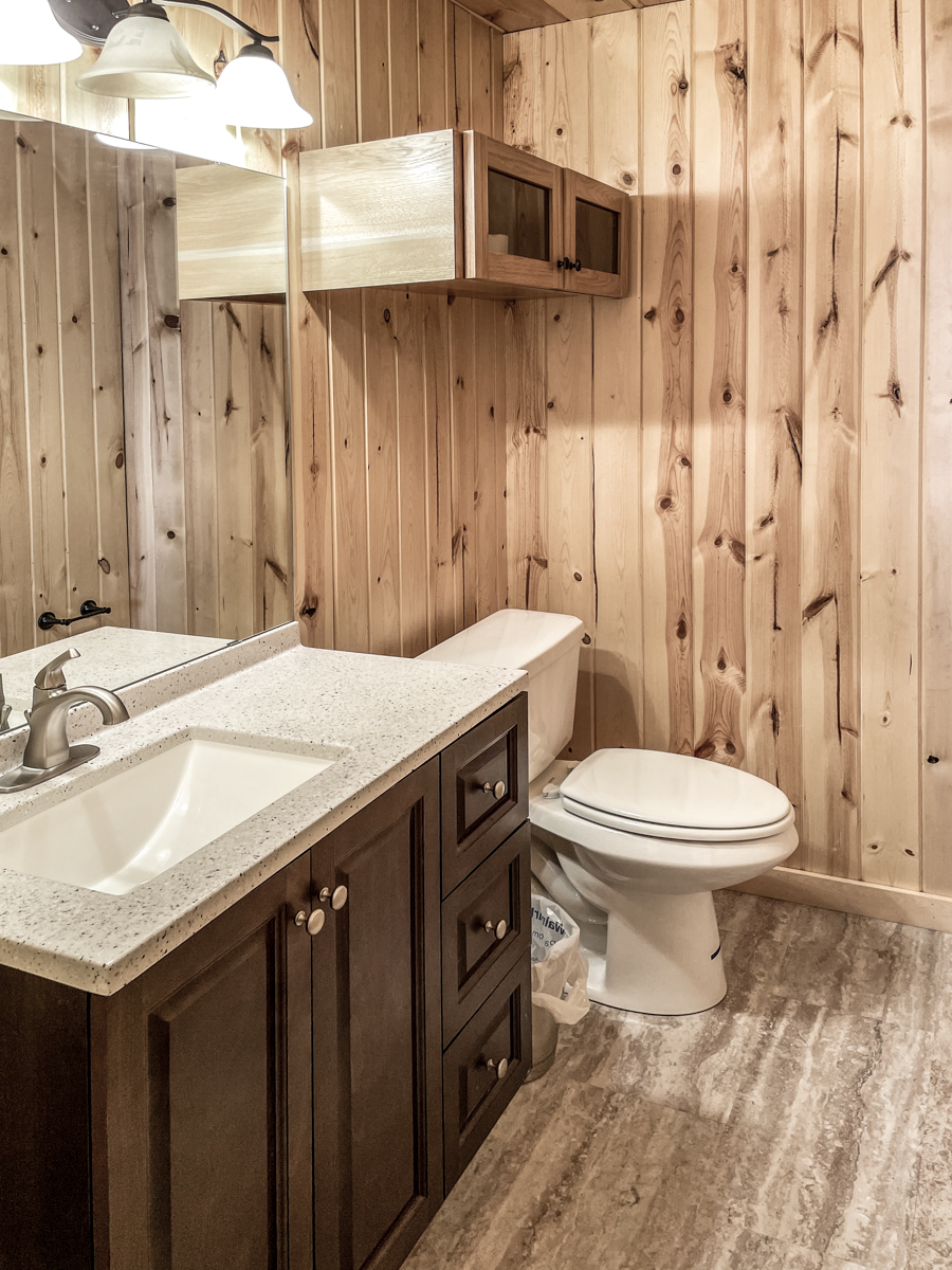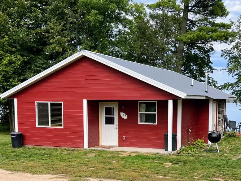 Cabin 7 has an open kitchen/dining with oak cabinets, vaulted ceiling over a large living room space plus a perfect lake view area. This cabin also features a gas fireplace. First bedroom has a king size bed with a 1/2 bathroom, second bedroom has two full size beds and the third bedroom has a full bed with a twin bunk above and a twin bed. A mini split is installed for your convenience for heat or A/C. The cabin comes with a fire pit, picnic table, charcoal grill and a staircase to a 80′ dock with power for your boat. Call for more details. Children 3 and under are FREE.