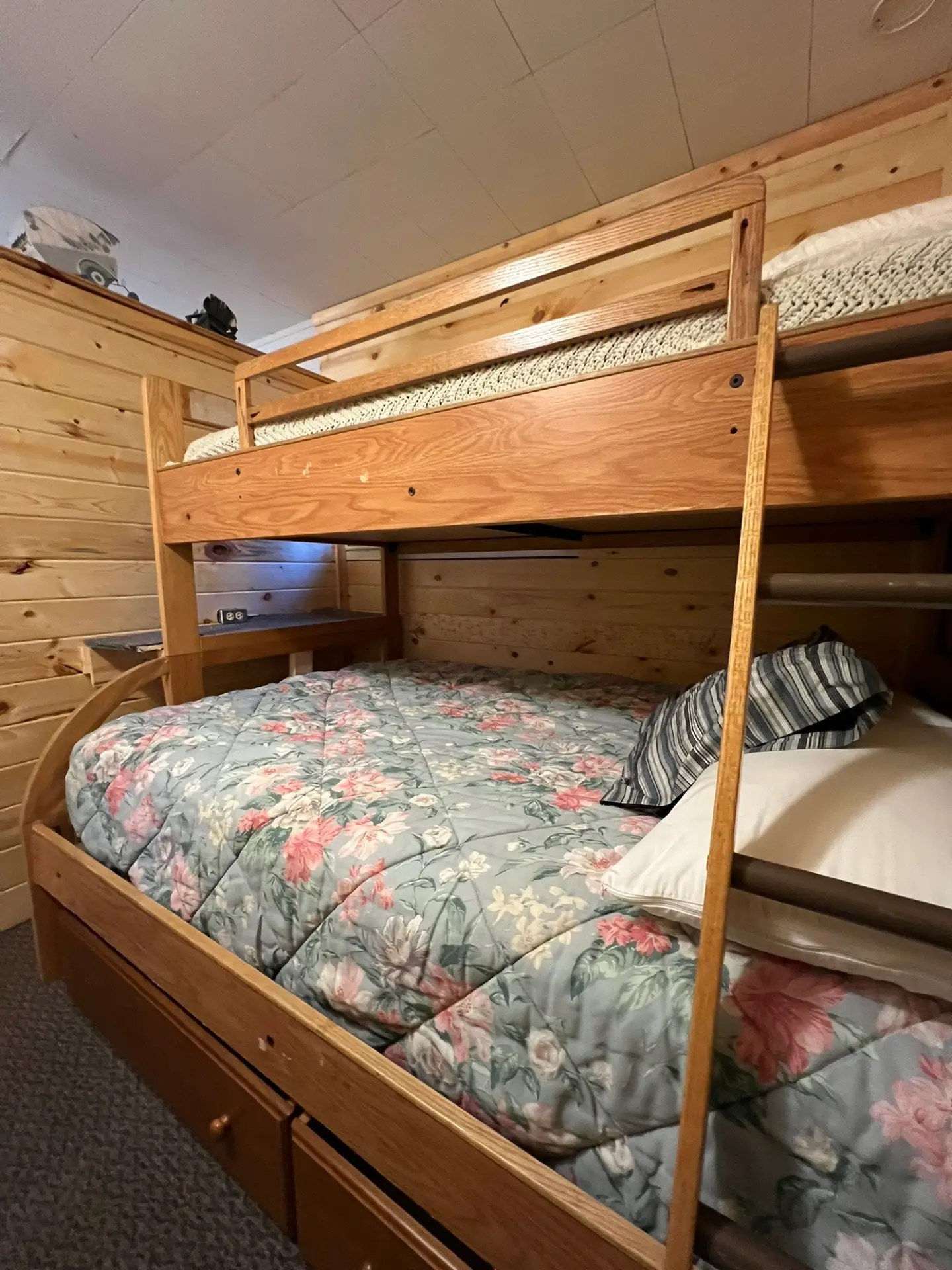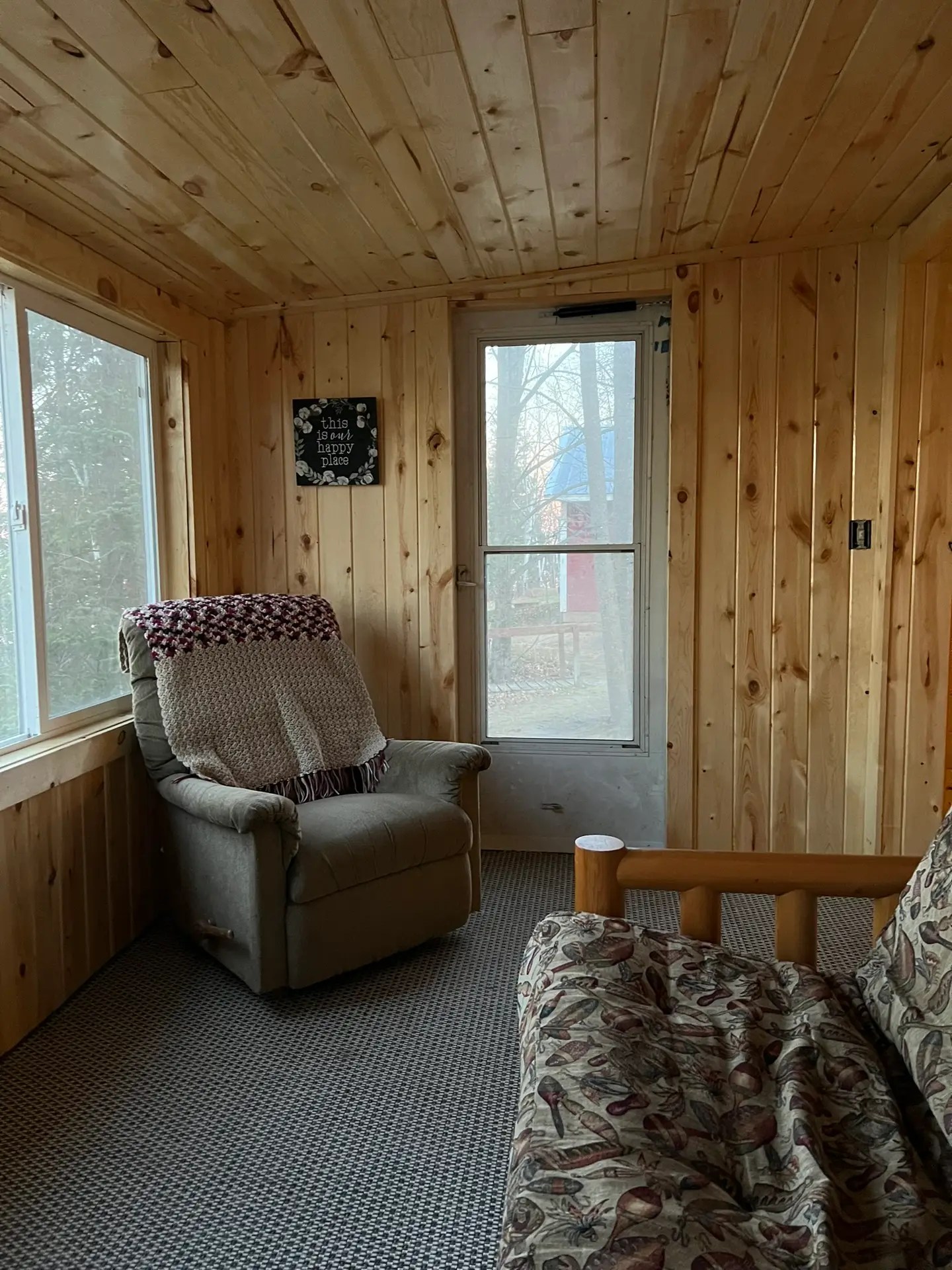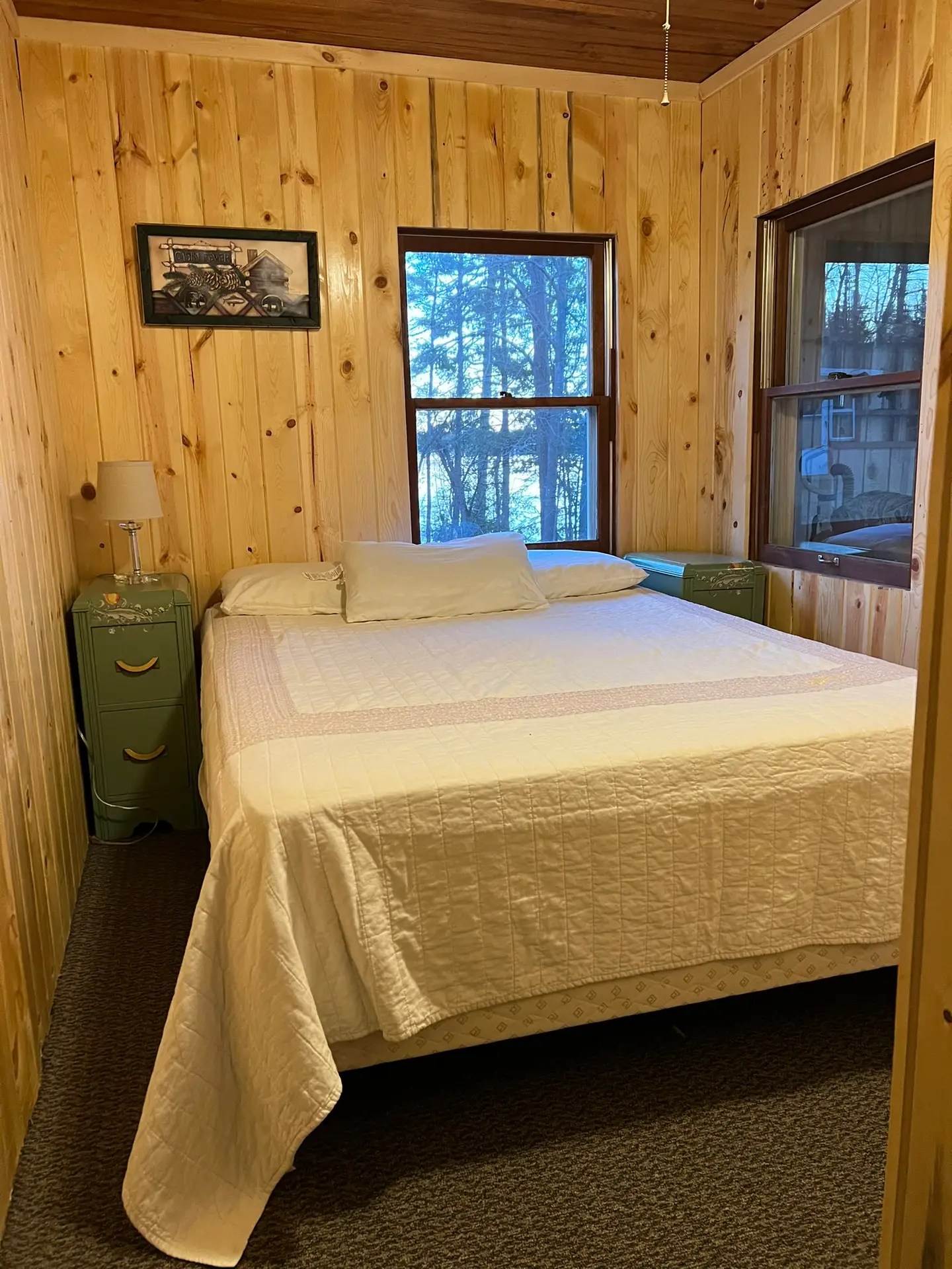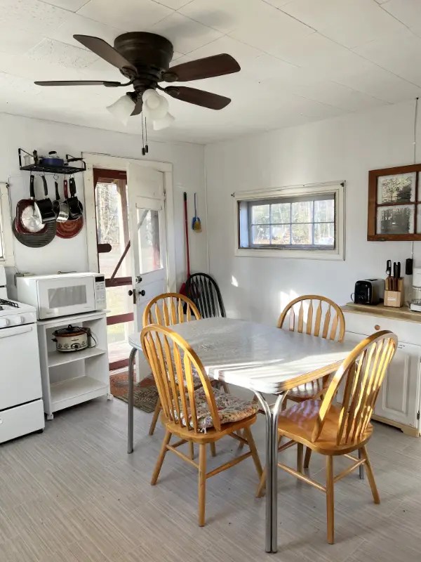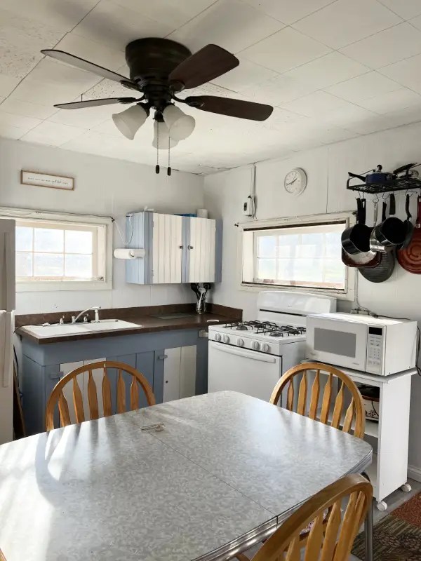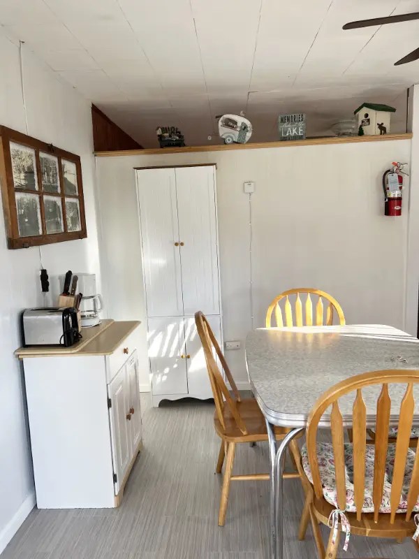 Cabin 8 includes a great, up-close lake view. This cabin features 2 bedrooms with a 1 queen size bed and 1 full size bed PLUS a futon in the living room. The kitchen is bright and sunny and has plenty of cabinets including a pantry. Everything you need is here including range, refrigerator, microwave, toaster, coffee pot and most other kitchen utensils. A wall heater helps for those cooler spring and fall days plus AC for summer. The cabin comes with a picnic table, charcoal grill and your very own fire pit. (Wood is available for purchase). Ages 3 and under are Free