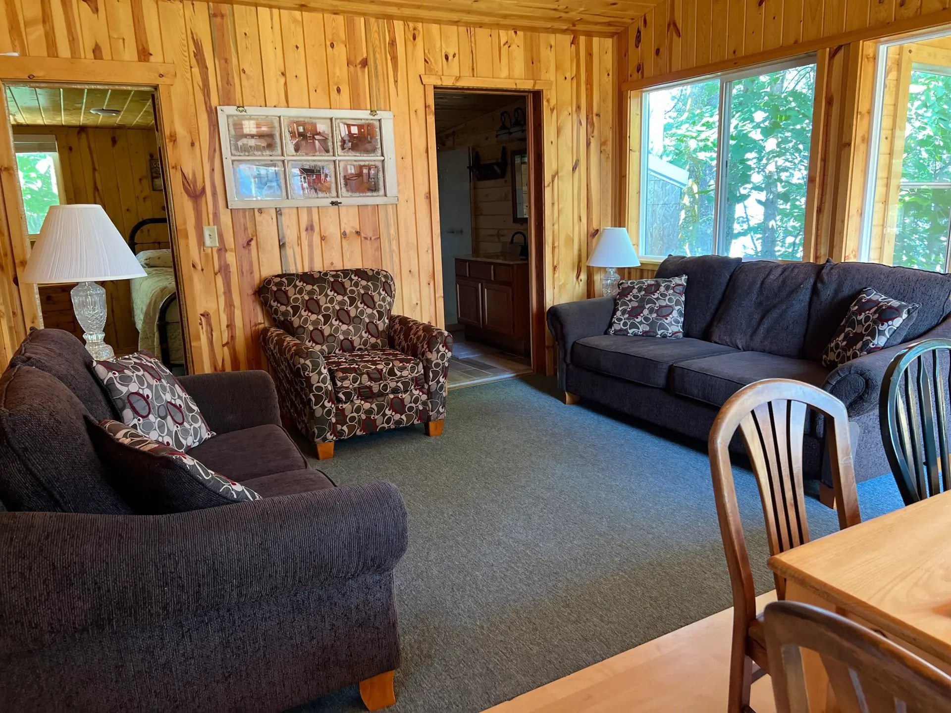 Cabin 9 was updated and remodeled with newly pined walls and ceilings. The lake view is so beautiful and can be enjoyed viewing through new windows and a 3 season attached porch. The living area features vaulted ceilings with a ceiling fan, a large couch, love seat and a matching comfy stuffed chair, along with a large dining area with maple flooring. Two bedrooms offer a queen bed in the front bedroom and a full size bed, twin bed and a set of twin bunk beds in the back bedroom. The bathroom has also been recently remodeled with a large shower and vanity. The kitchen would be your kitchen away from home with all the amenities. A mini split has been installed for your heat and AC. This cabin provides a more private setting near the woods and comes with a picnic table, charcoal grill and fire pit. Extra person charges apply over base rate UP to maximum. Call for more details.