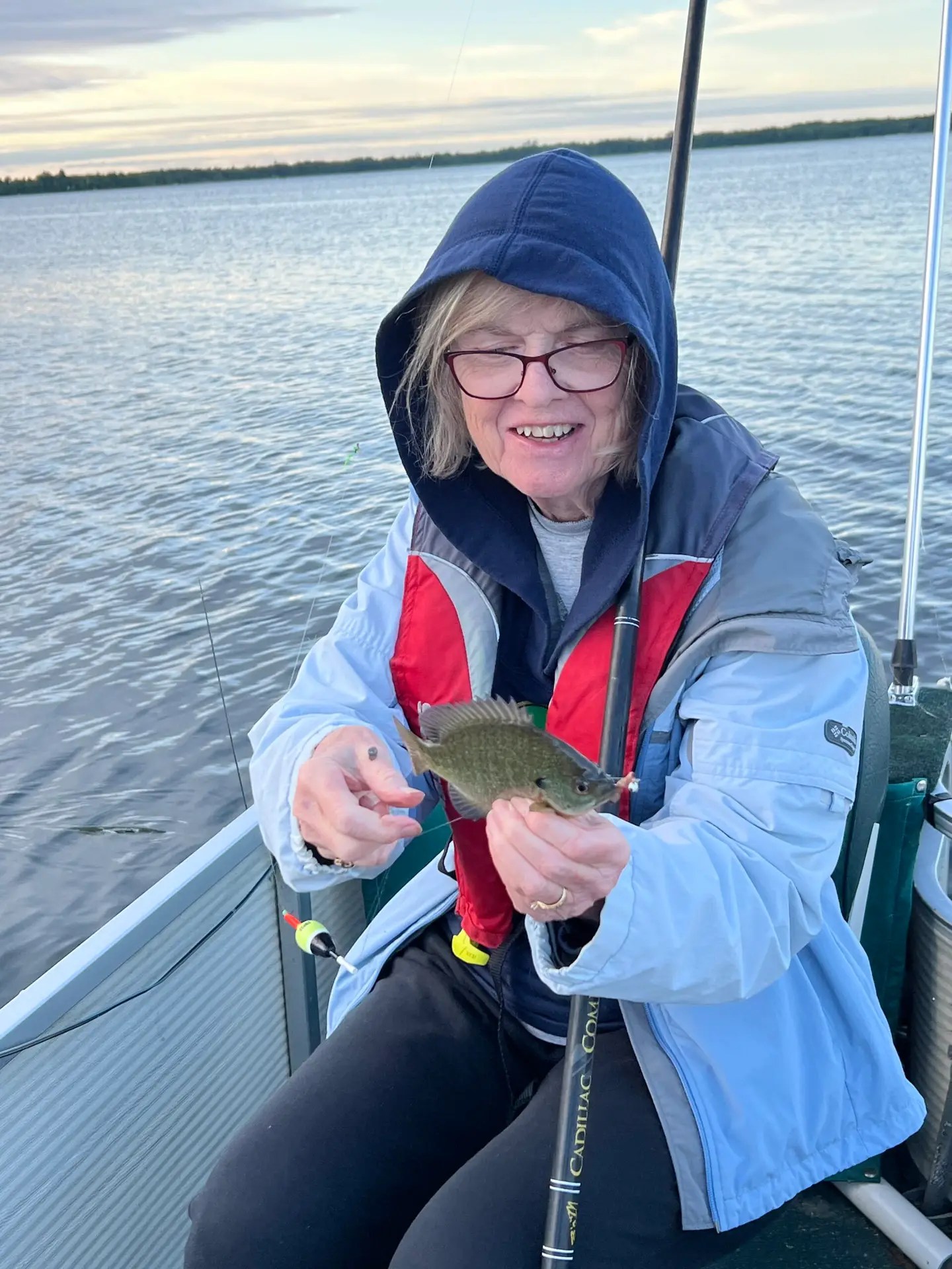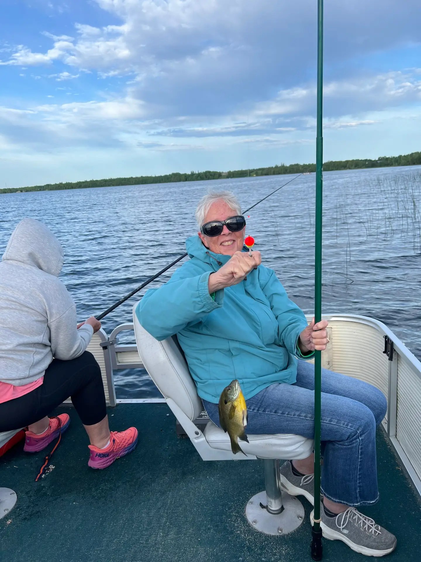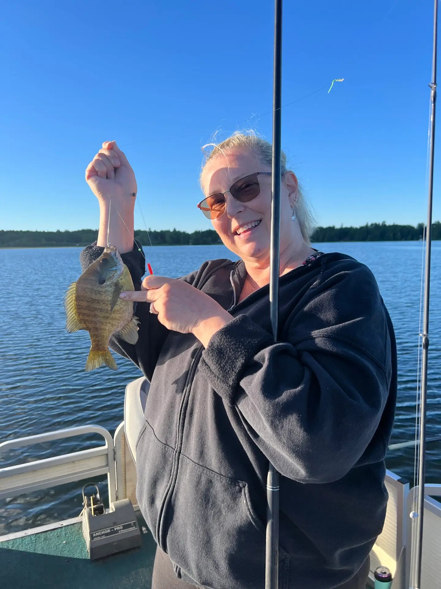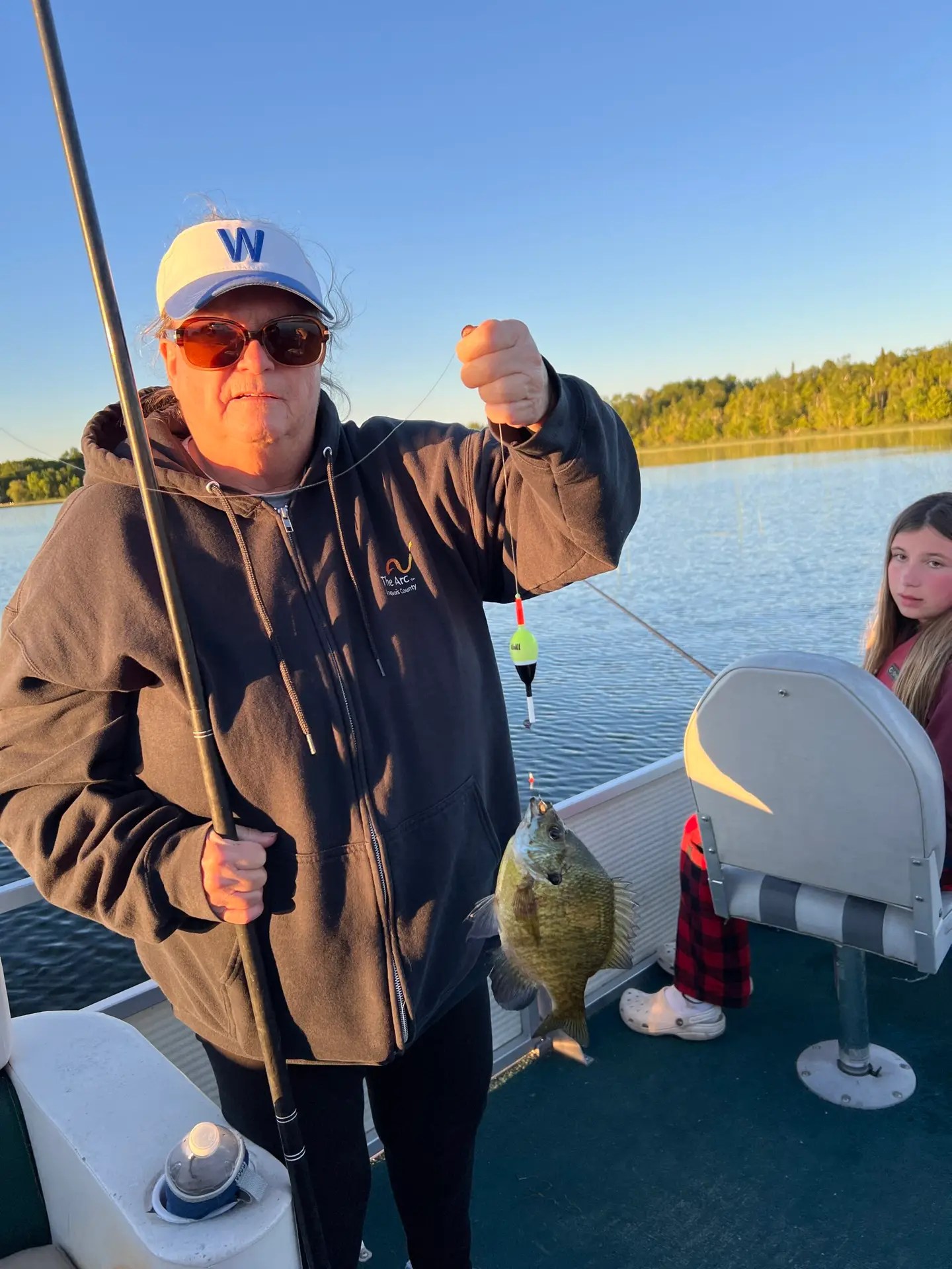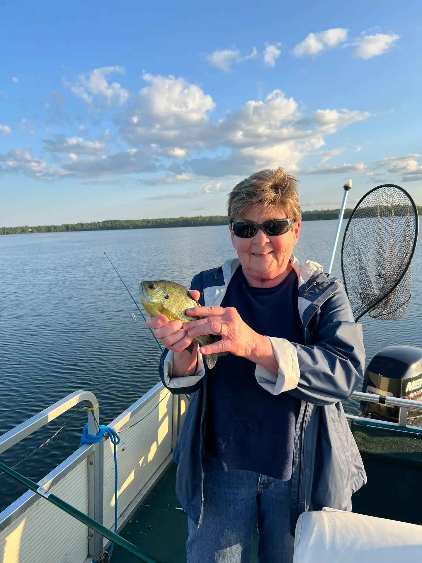 Mandy takes the ladies at the resort out on the pontoon and teaches them how to use cane poles to catch those really BIG bluegills and sunfish. There have been times that a walleye or northern have been caught also. And for those that don’t touch fish or bait; no worries, as Mandy baits the hooks and takes the fish off.