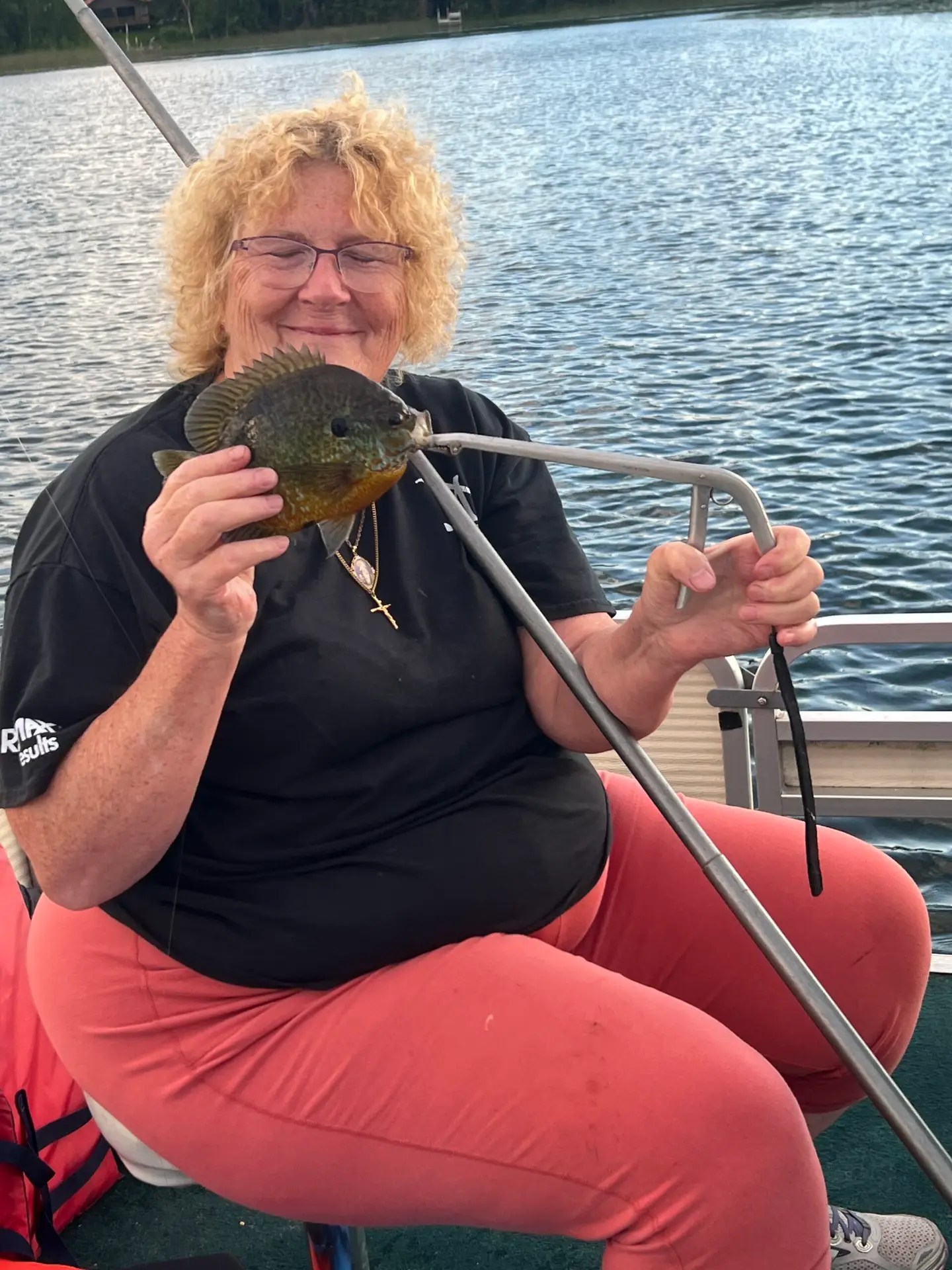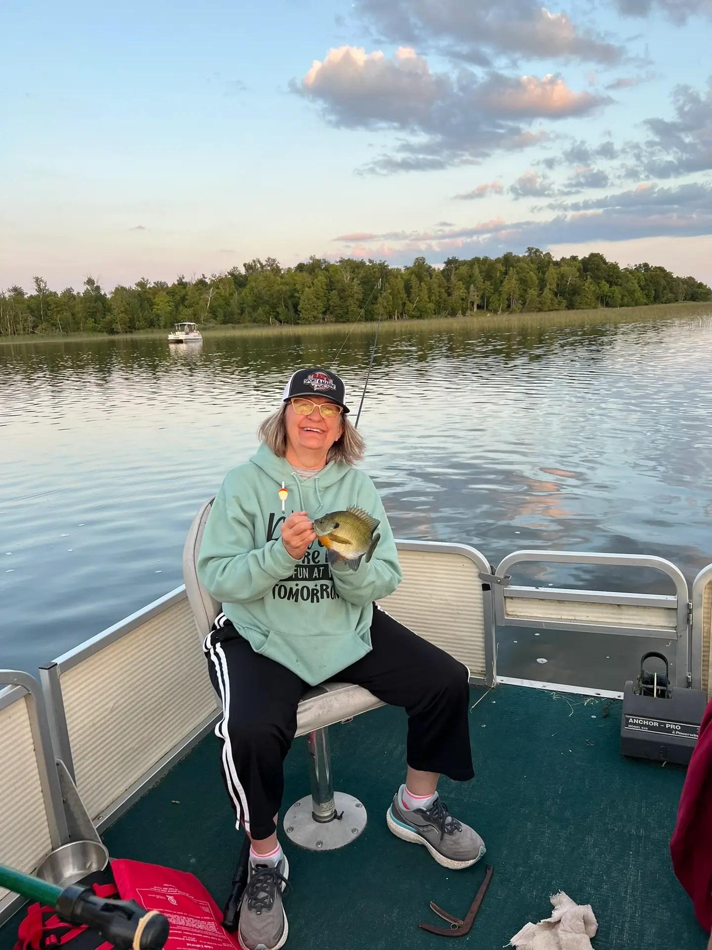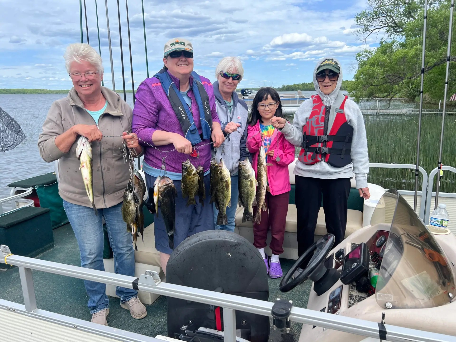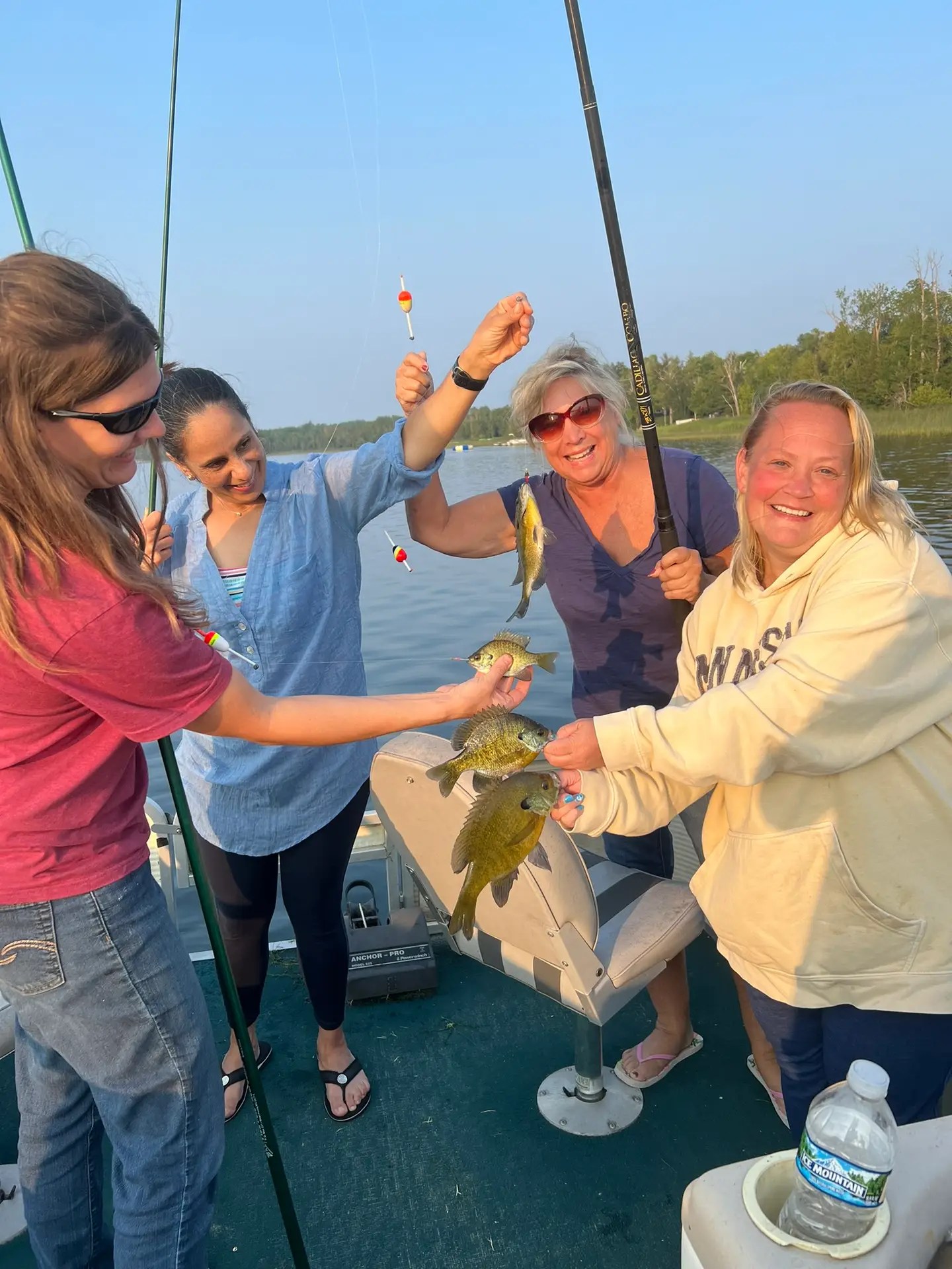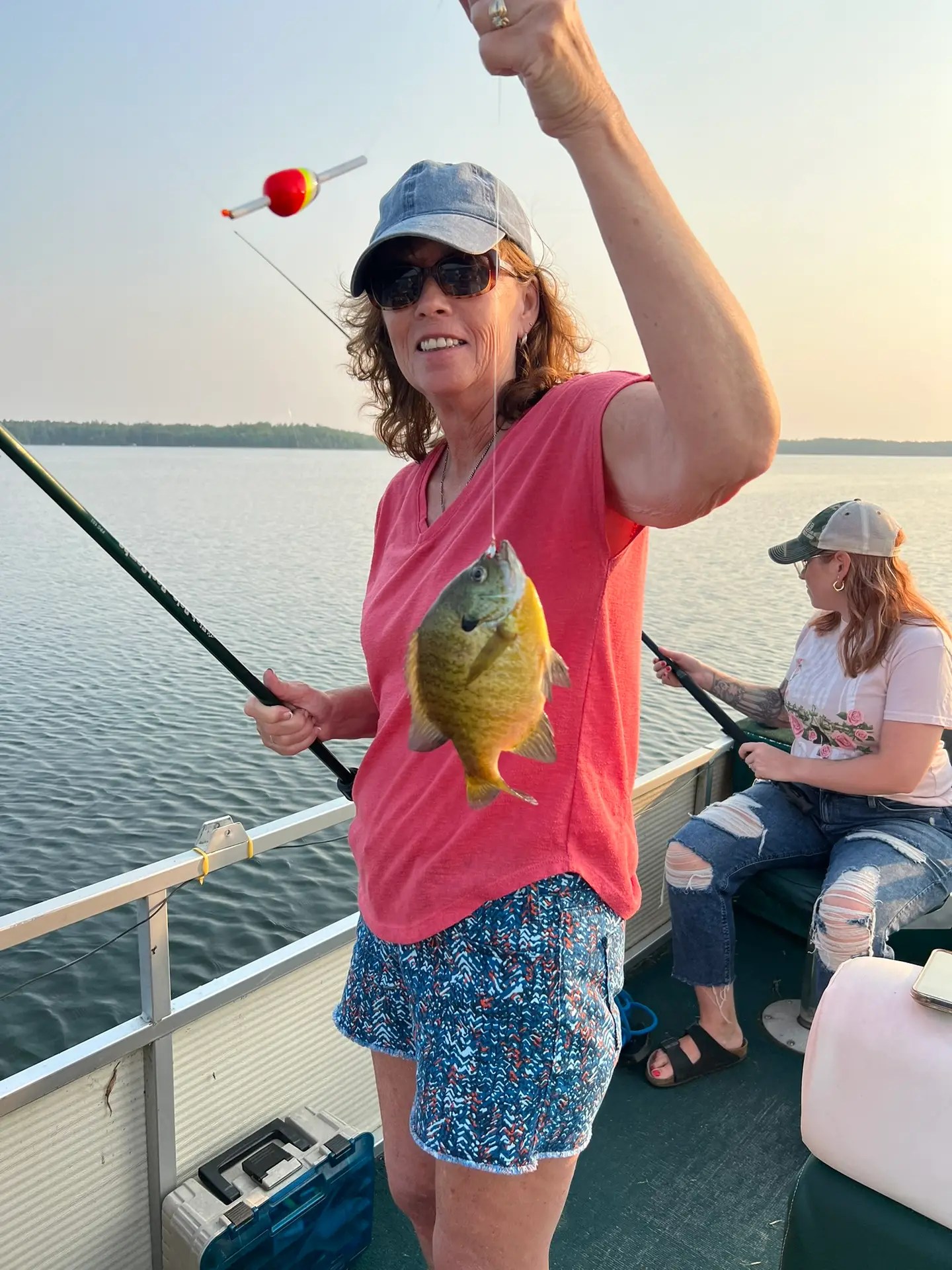Mandy takes the ladies at the resort out on the pontoon and teaches them how to use cane poles to catch those really BIG bluegills and sunfish. There have been times that a walleye or northern have been caught also. And for those that don’t touch fish or bait; no worries, as Mandy baits the hooks and takes the fish off.