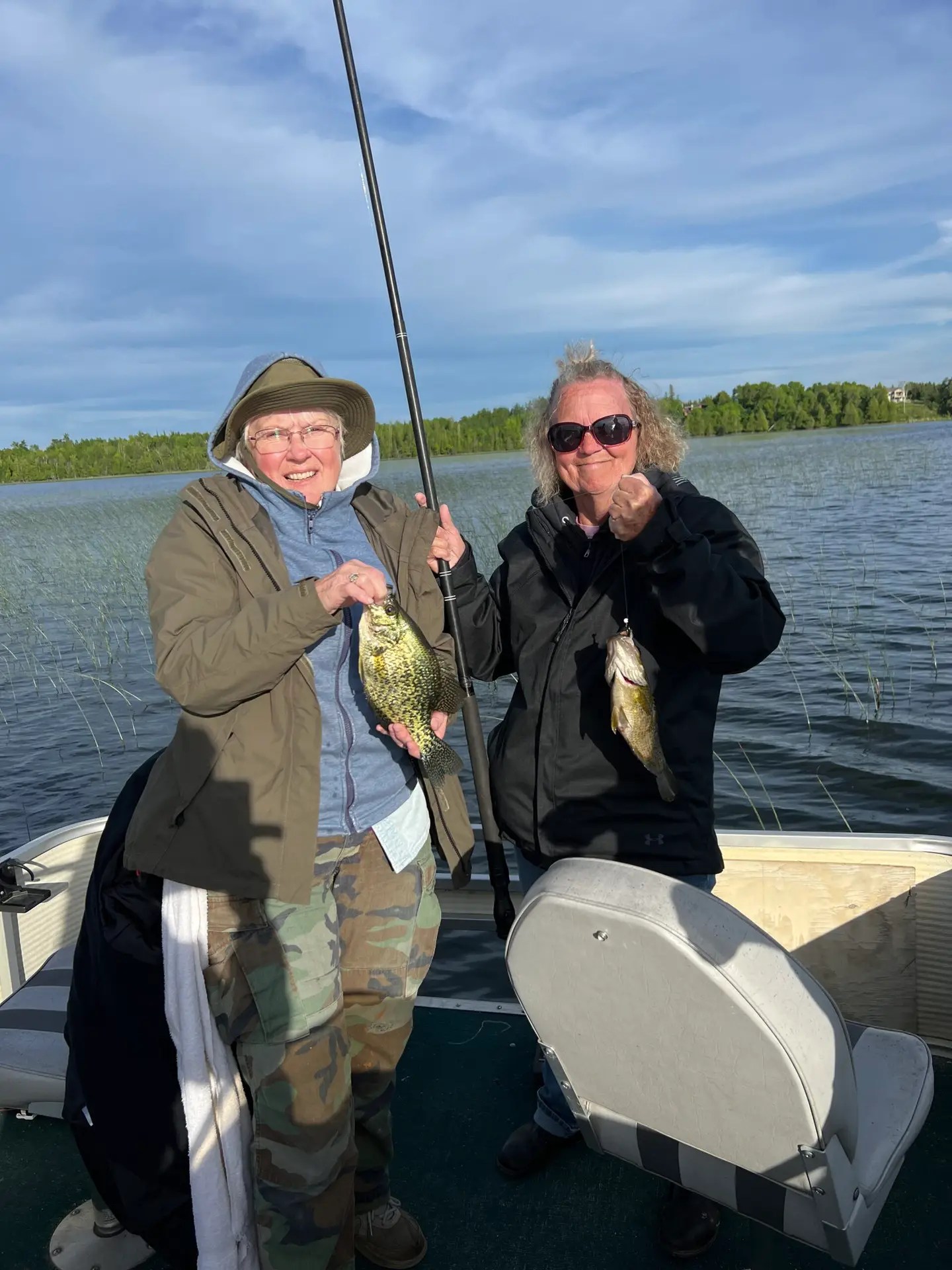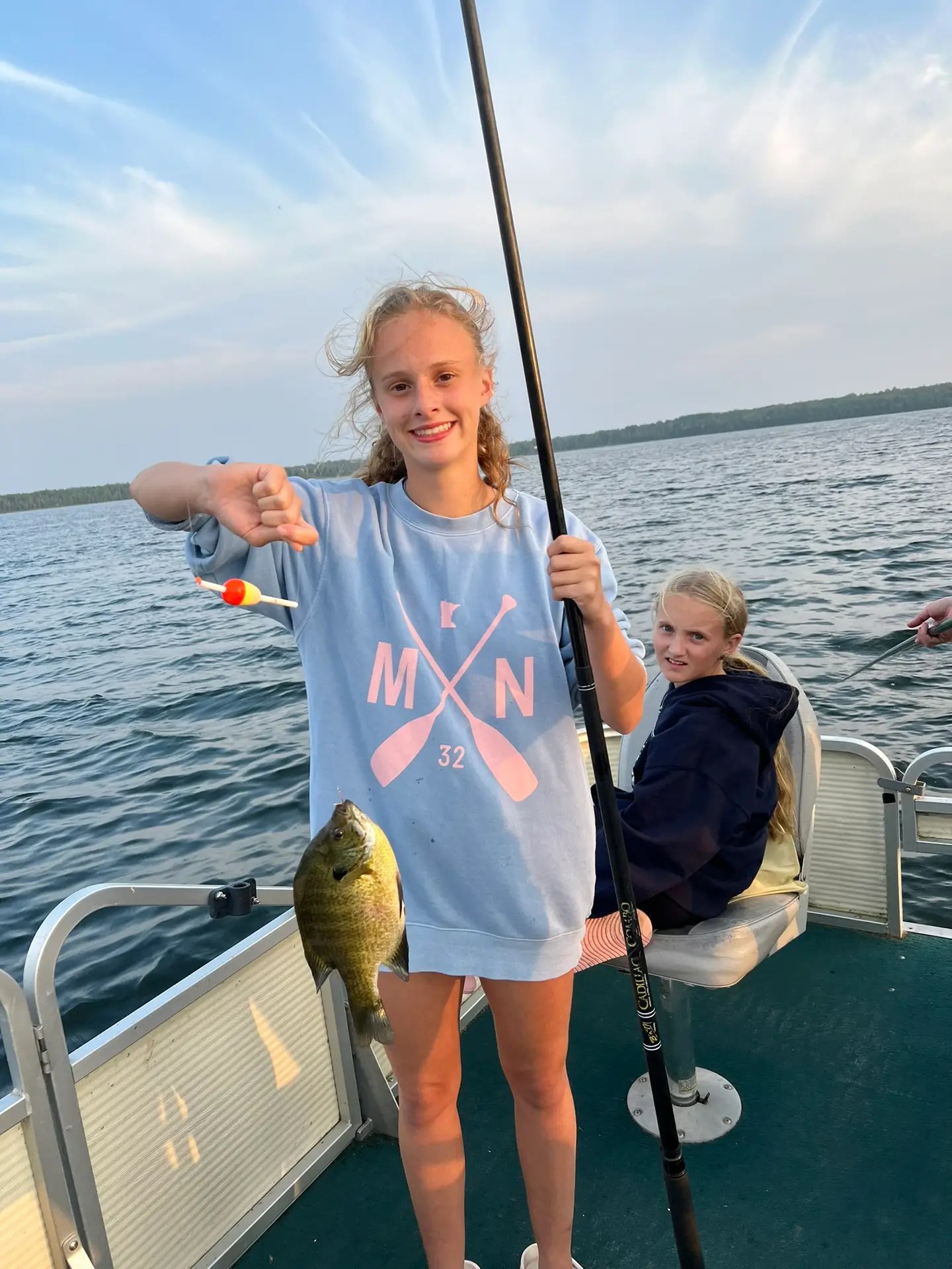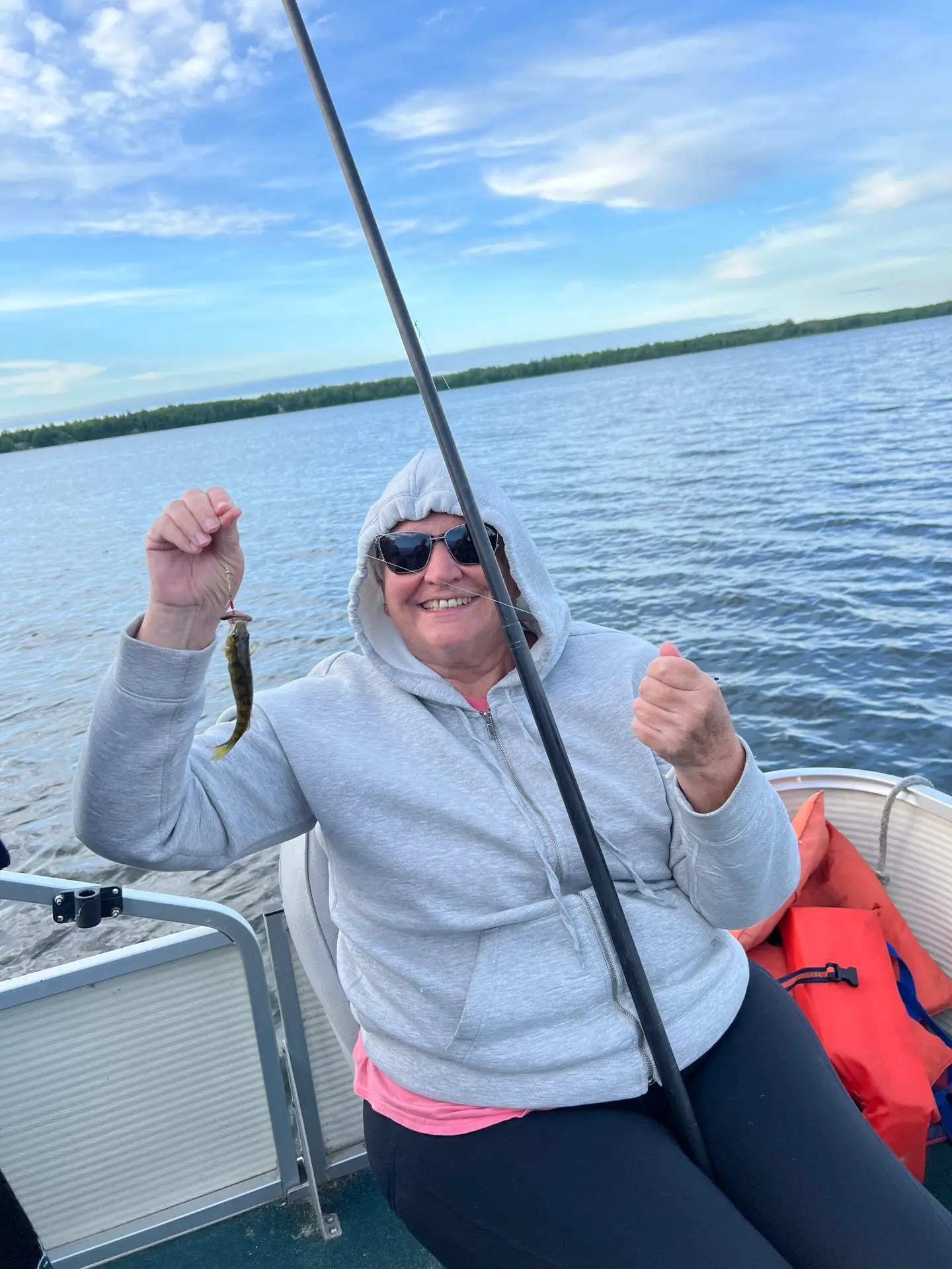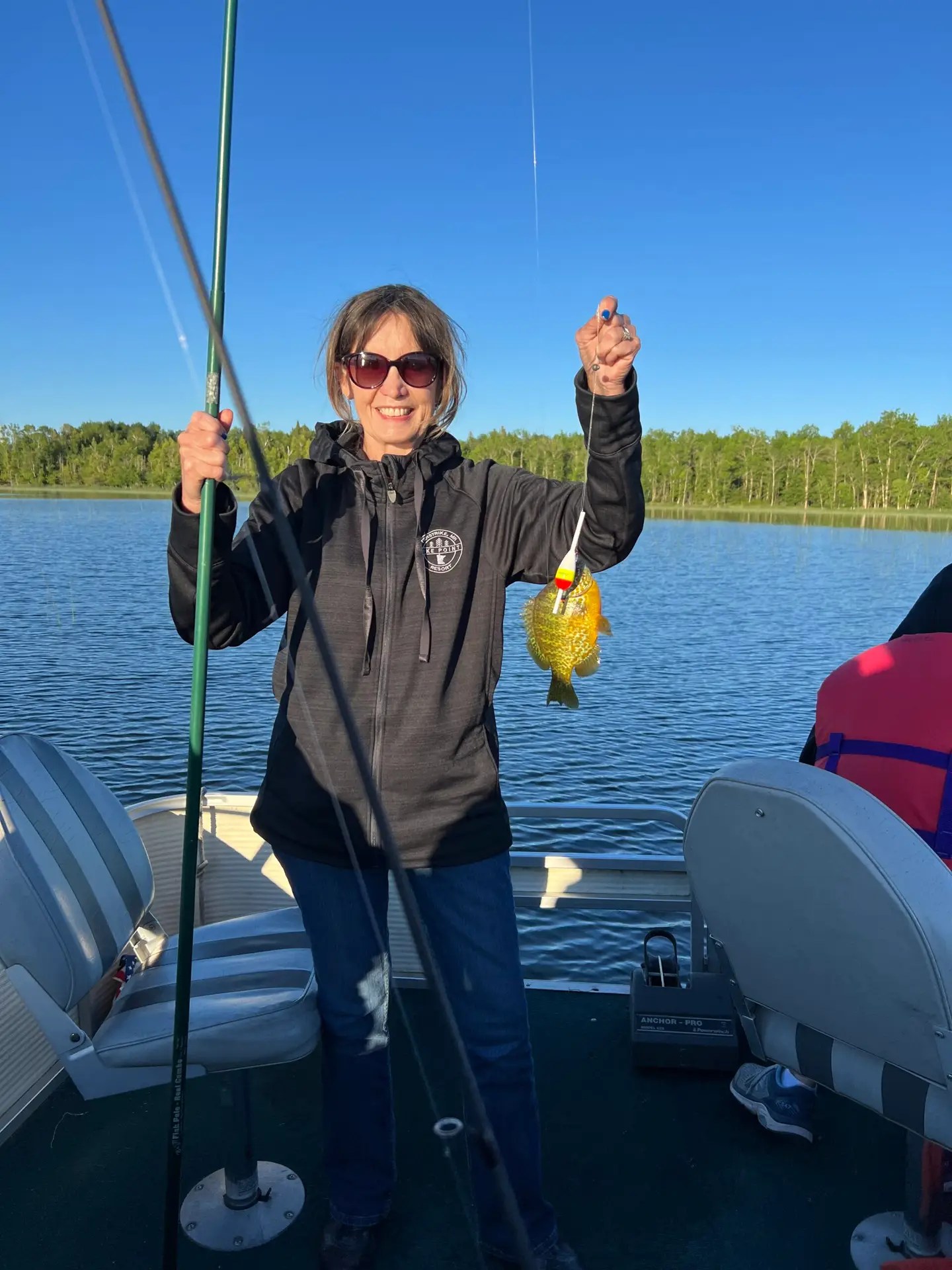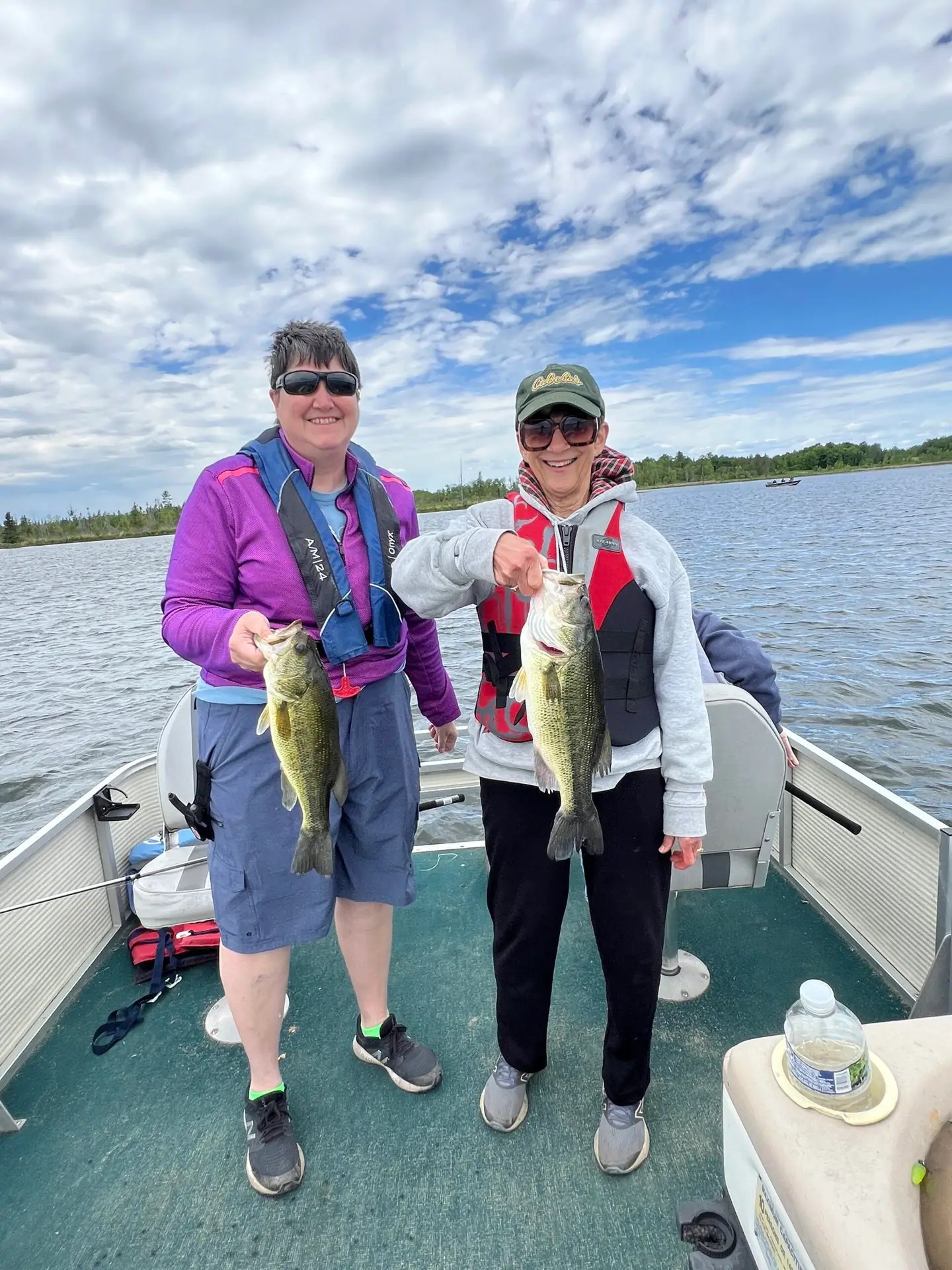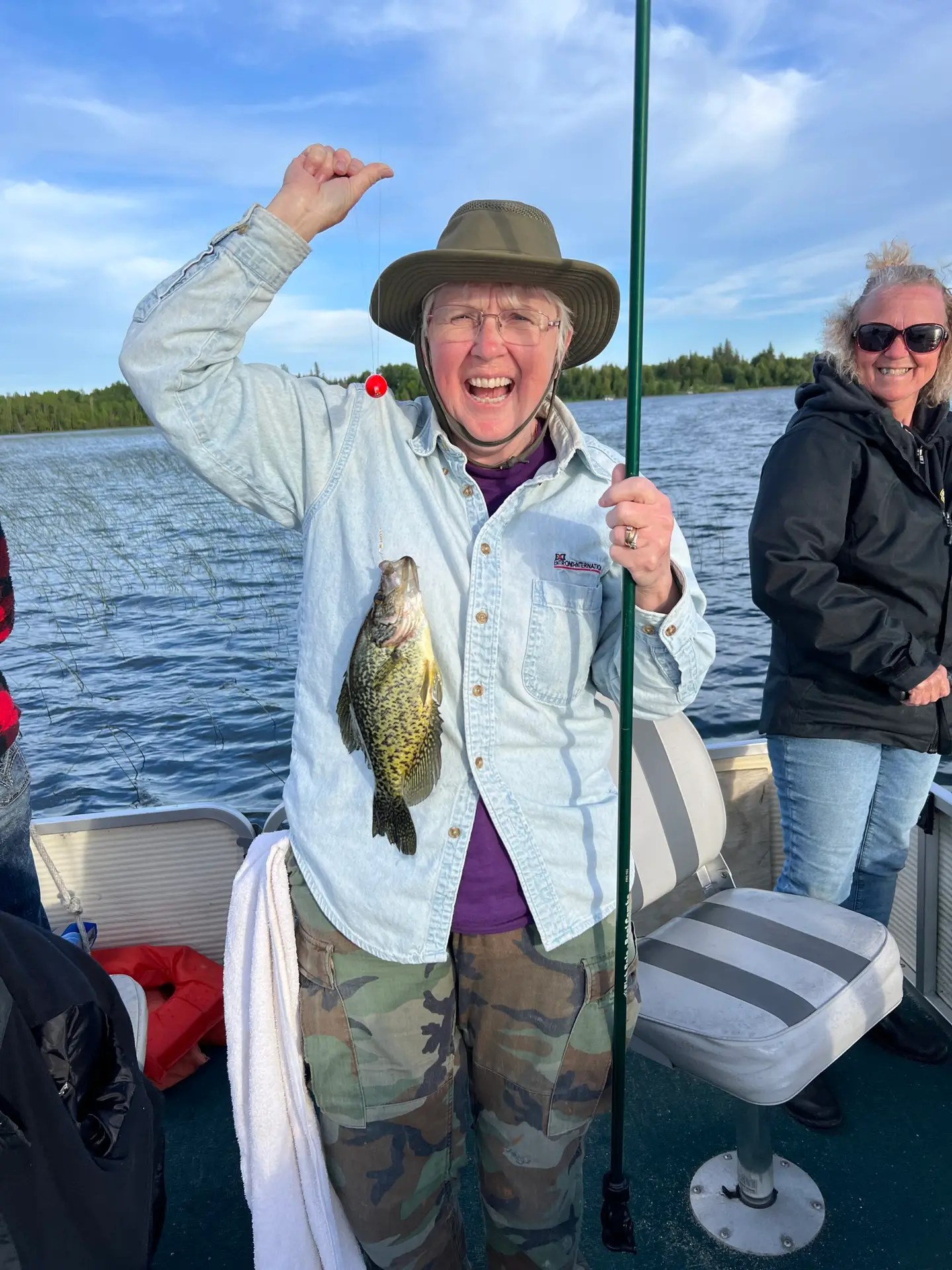 Mandy takes the ladies at the resort out on the pontoon and teaches them how to use cane poles to catch those really BIG bluegills and sunfish. There have been times that a walleye or northern have been caught also. And for those that don’t touch fish or bait; no worries, as Mandy baits the hooks and takes the fish off.