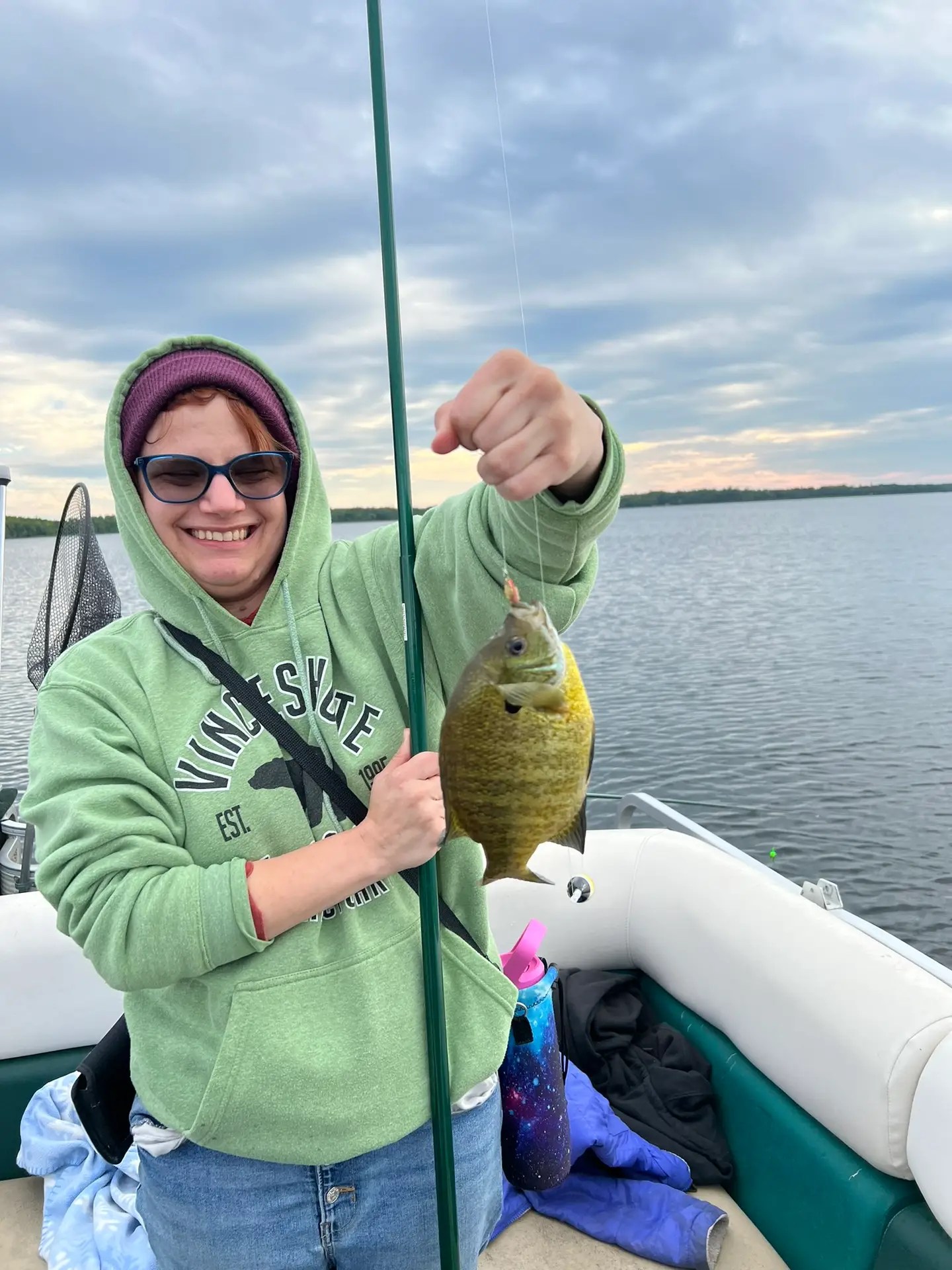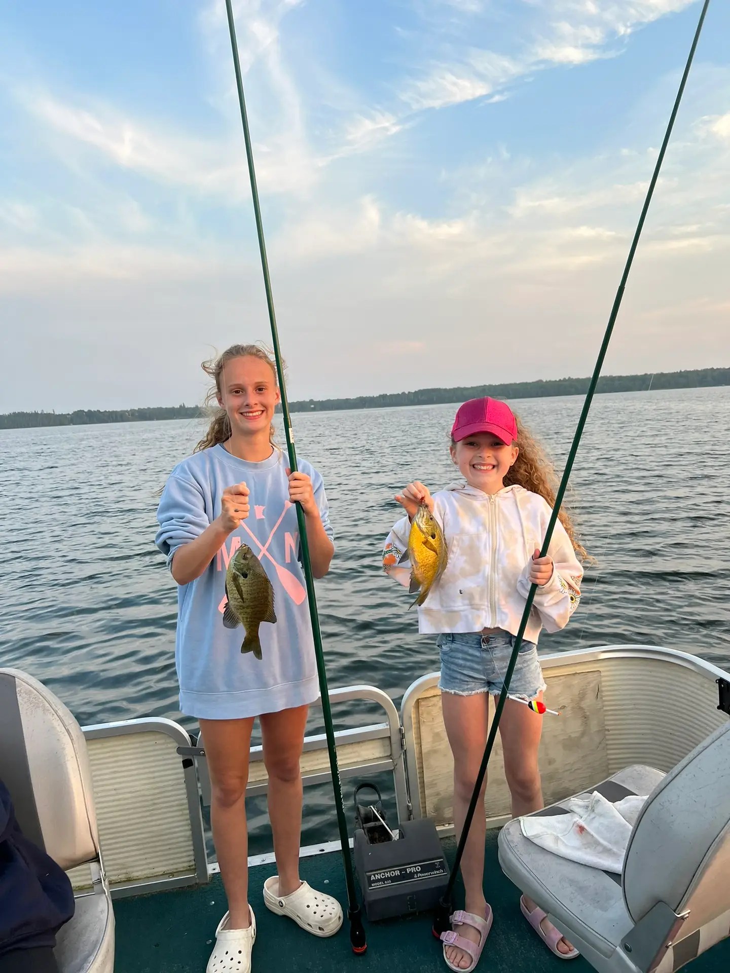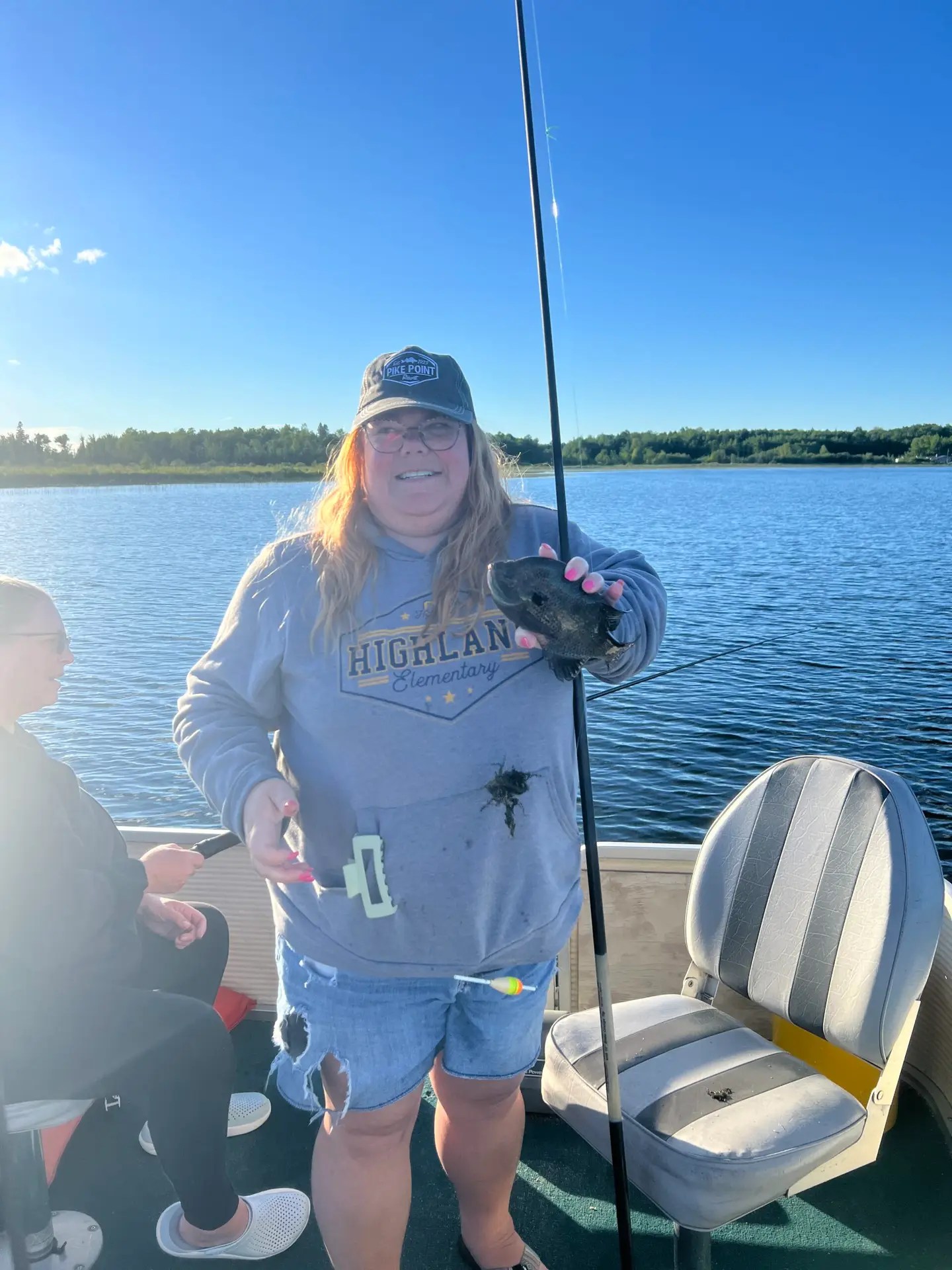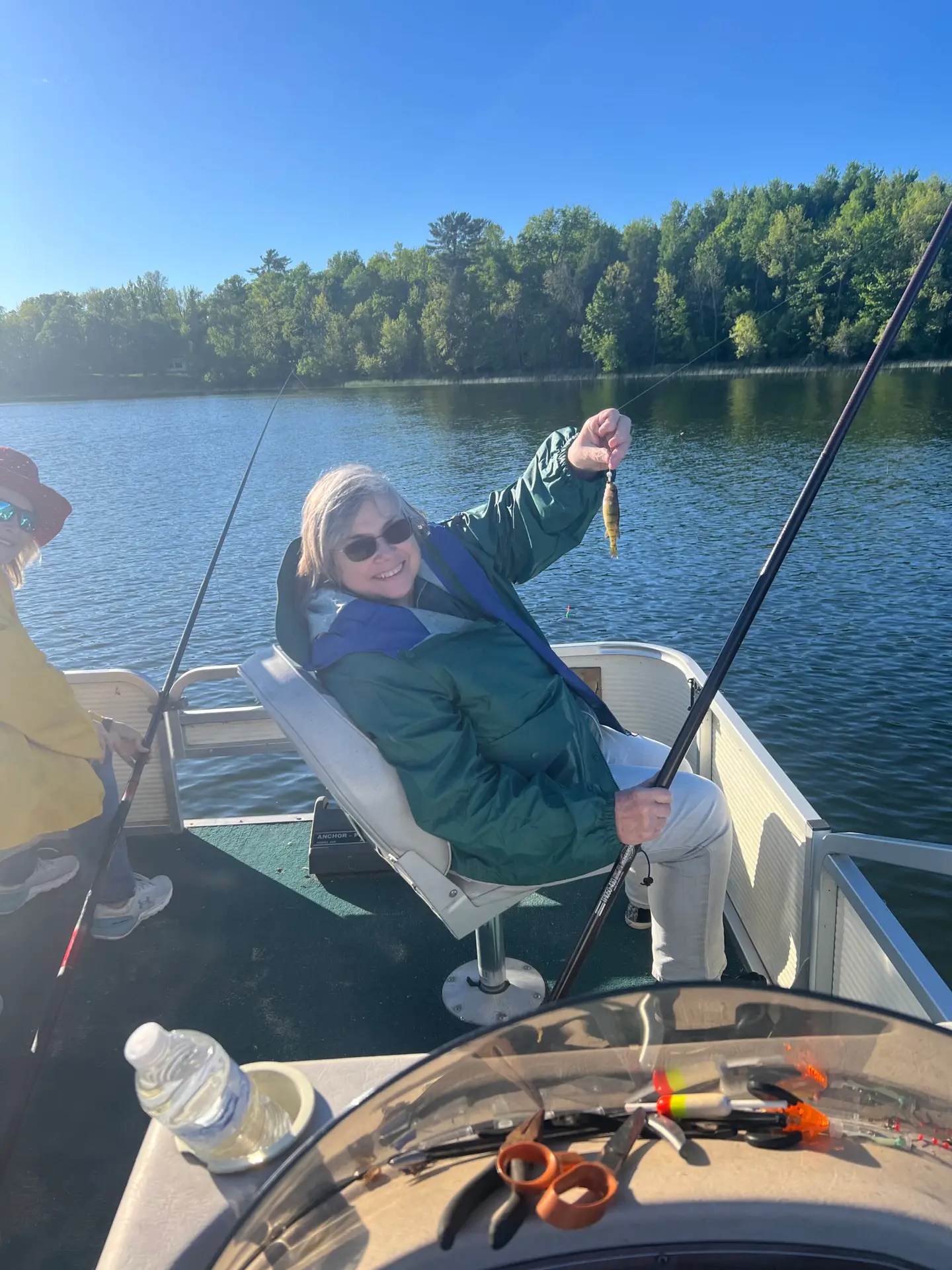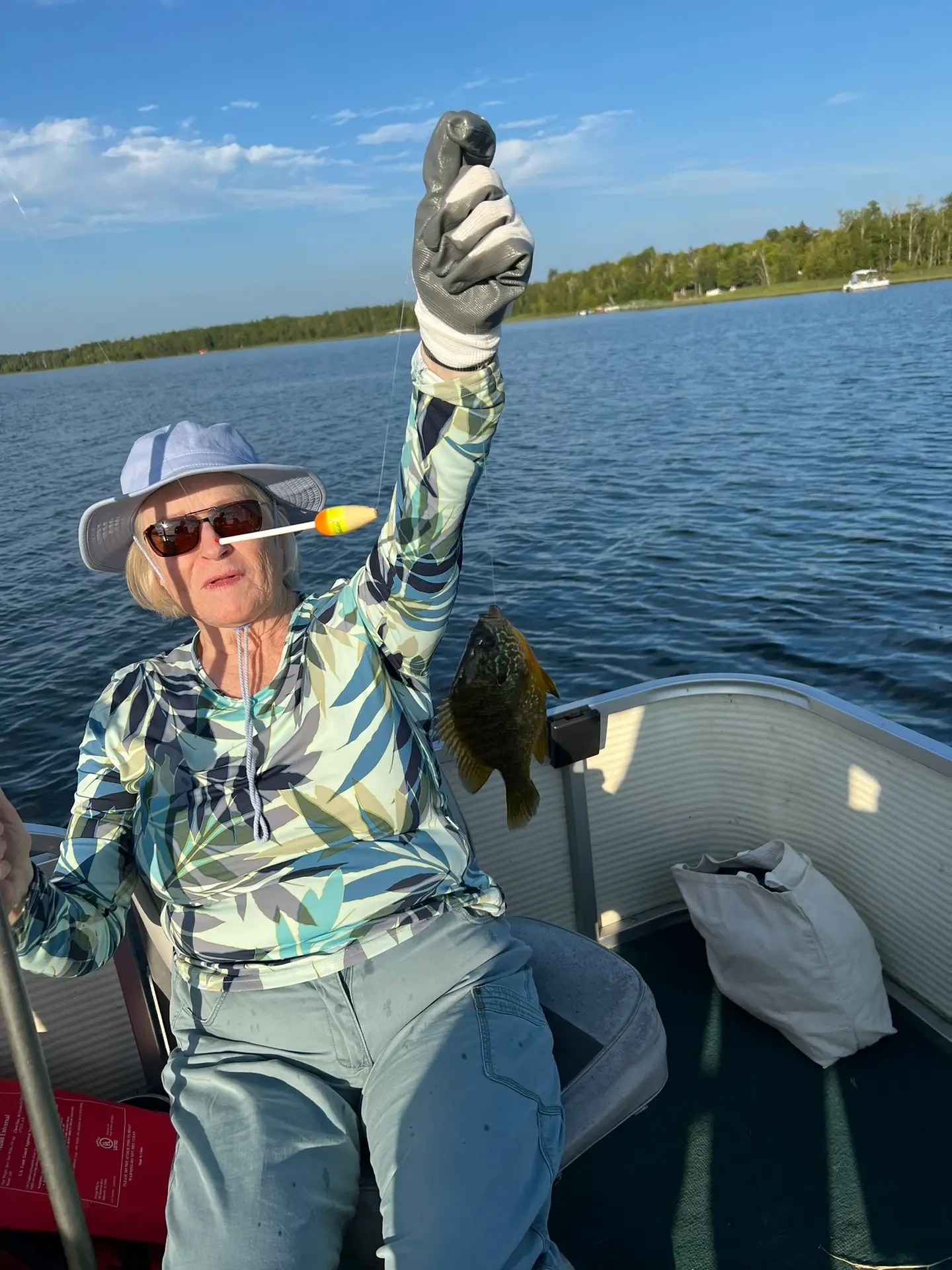 Mandy takes the ladies at the resort out on the pontoon and teaches them how to use cane poles to catch those really BIG bluegills and sunfish. There have been times that a walleye or northern have been caught also. And for those that don’t touch fish or bait; no worries, as Mandy baits the hooks and takes the fish off.